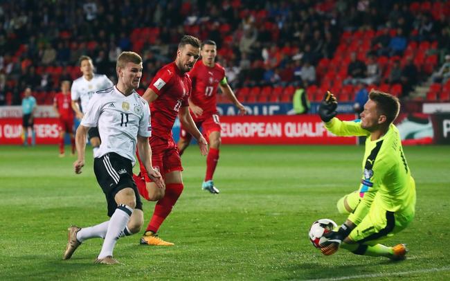 德国首发11人德国开场仅4分钟取得领先,厄齐尔妙传,维尔纳8码处单刀捅射入网[点击观看进球视频]。捷克展开反攻,扬-科皮奇12码处的射门被施廷德尔及时挡出底线。鲍里尔远射被特尔施特根扑出,苏西和卡拉斯的外围射门相继偏出。德国重新控制比赛,施廷德尔12码处扫射被挡出,克罗斯远射被门将救下。克罗斯右路任意球传中,胡梅尔斯头球攻门偏出。穆勒半场结束前犯规被罚黄牌。